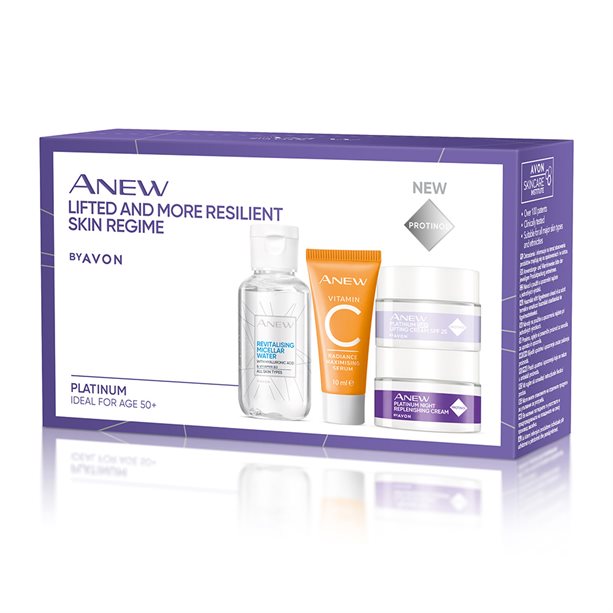 The Anew Platinum Lifted & More Resilient Skin Regime includes mini editions of our Revitalising Micellar Water, Radiance Maximising Serum and Platinum Day and Night Cream featuring Protinolâ„¢ Technology for a dual collagen boost.