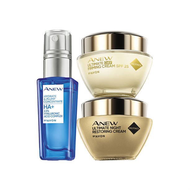 Discover the perfect replenishing skincare regime for age 40+. The Ultimate Hydrate & Plump Pack includes the intensely hydrating Anew Anti-Wrinkle Plumping Concentrate, formulated with 3.5% hyaluronic acid complex, for instantly plumped-looking skin. Follow with the Protinol™-infused Ultimate Day and Night Creams and you have the everything you need for radiant, firmer-looking skin in just 2 days.