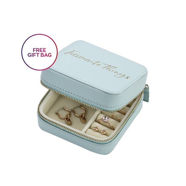 The embossed slogan reads Favourite Things.Ring slots and jewellery compartment.Zip closure. • Perfect travel size.Comes with a gift bag.