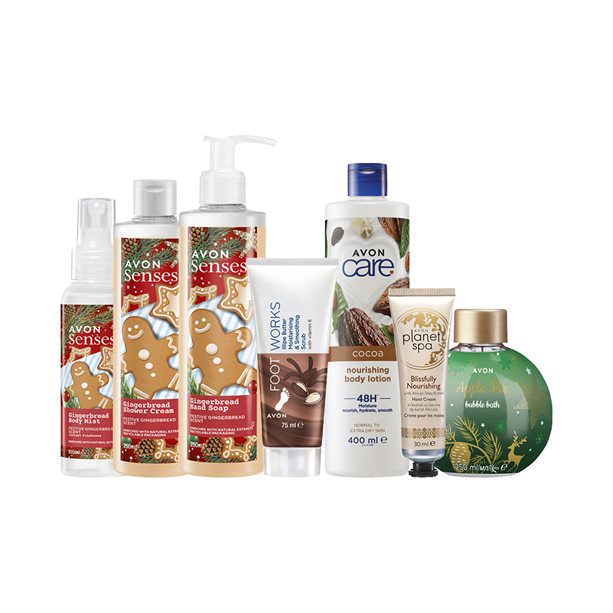 About me: Indulge in seasonal scents with our Festive Pamper Pack, bursting with bath and body treats for soft, glowing skin from head to toe. The collection makes the perfect self-care gift, both for yourself and a busy loved one. What’s included: • 1 x Care Cocoa Butter Nourishing Body Lotion 400ml.• 1 x Planet Spa Blissfully Nourishing Hand Cream 30ml.• 1 x Foot Works Illipe Butter Moisturising & Smoothing Scrub 75ml.• 1 x Senses Gingerbread Shower Cream 250ml.• 1 x Apple Pie Bubble Bath 250ml.• 1 x Senses Gingerbread Hand Soap 250ml.• 1 x Senses Gingerbread Body Mist 100ml.