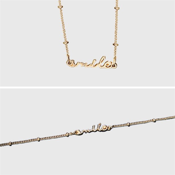 Necklace: Gold-tone with engraved script pendant. Approx. 42cm + 9cm extension chain.