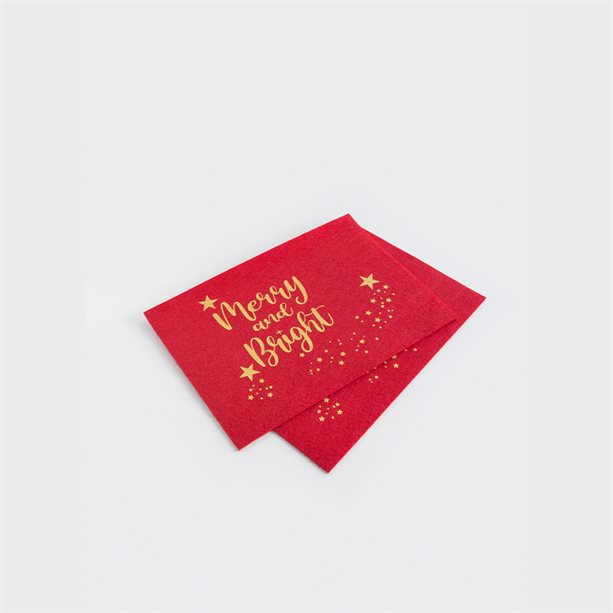 Pack of 2 placemats. Festive gold-star print with ‘Merry & Bright’ slogan. Matching table runner and cutlery holders available.