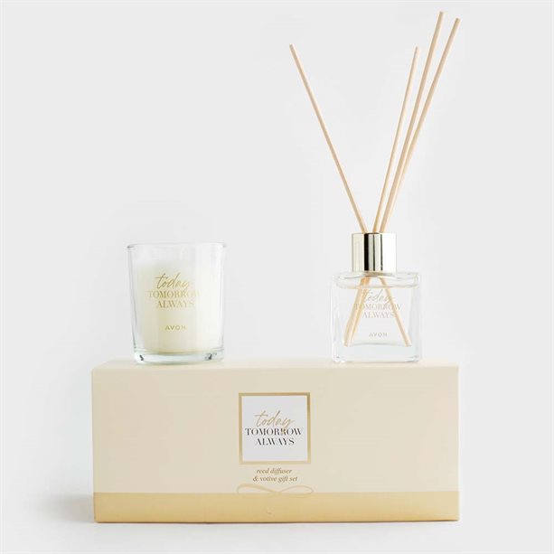 Home fragrance gift set.Based on our bestselling Today perfume, with the scent of neroli, butterfly bloom and silk musk.Includes 1 reed diffuser, lasts up to 4 weeks, and 1 votive, burns for up to 28.5 hours.