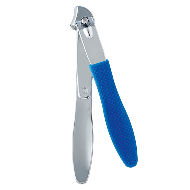 Chrome-plated, carbon steel toenail clippers with silicone grip.